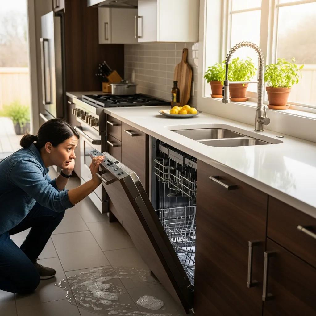 Dishwasher with water pooling, highlighting drainage issues in a modern kitchen